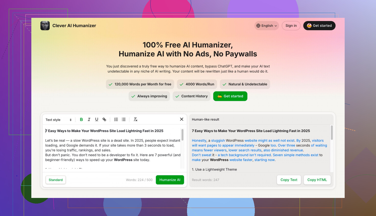 Pros for Clever Free Ai Humanizer? It’s quick, doesn’t drown you in ads, and the output is usually messier in a good way—not just swapping buzzwords, but rearranging structure and cutting repetition, which matters more than you think. The cons: every so often it introduces a weird colloquialism I’d never use, so you still need to edit after. Also, I’ve had it “dumb down” some technical content a little too much, so if you’re working on niche topics, double-check your facts stay intact.