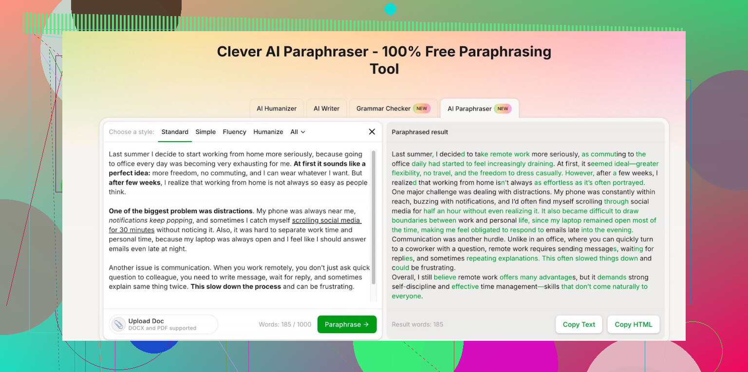 If you want a free AI paraphrasing tool that doesn’t sound like a fridge manual, Clever Ai Humanizer is actually one of the few that hits “natural” more often than not. Its paraphrase tool feels less stiff than a lot of the other free ones, and the fact that styles are not paywalled is a big deal. That said, I would not rely on any paraphraser as a full one-click solution, including this one. -