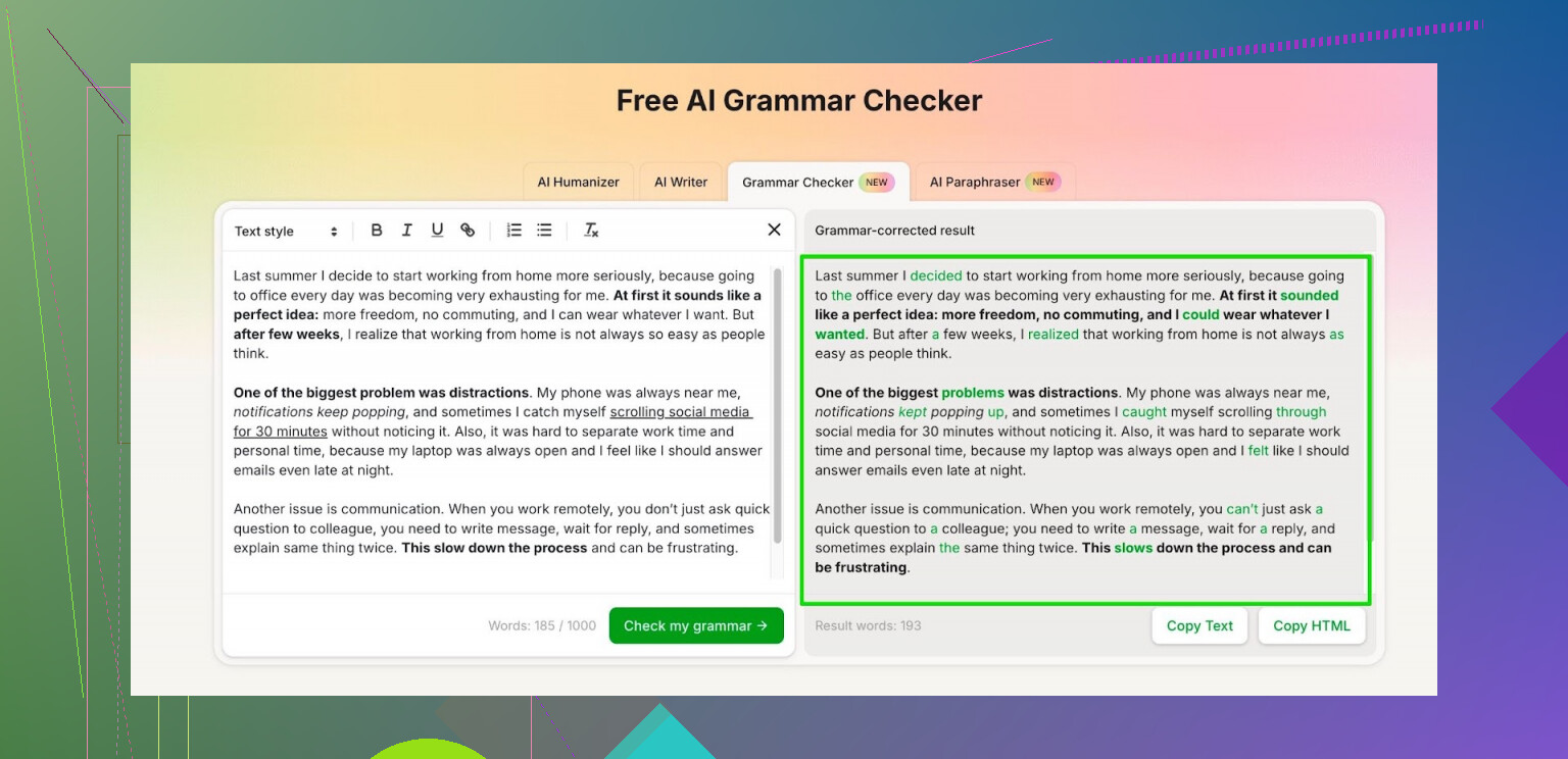 De laatste maanden gebruik ik de Clever AI Humanizer tool genaamd Gratis AI Grammaticacontrole hier: https://cleverhumanizer.ai/grammar-checker.