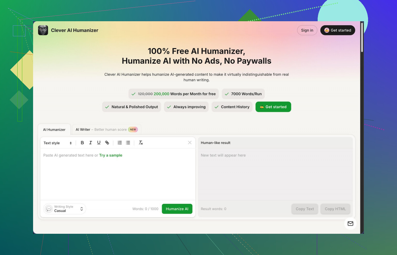 If you write daily with AI and are tired of babysitting detectors and word limits, Clever AI Humanizer feels like a practical “everyday kit” rather than a gimmick. No paywall in the middle of a long project, no aggressive upsell, and the free tier is not fake.