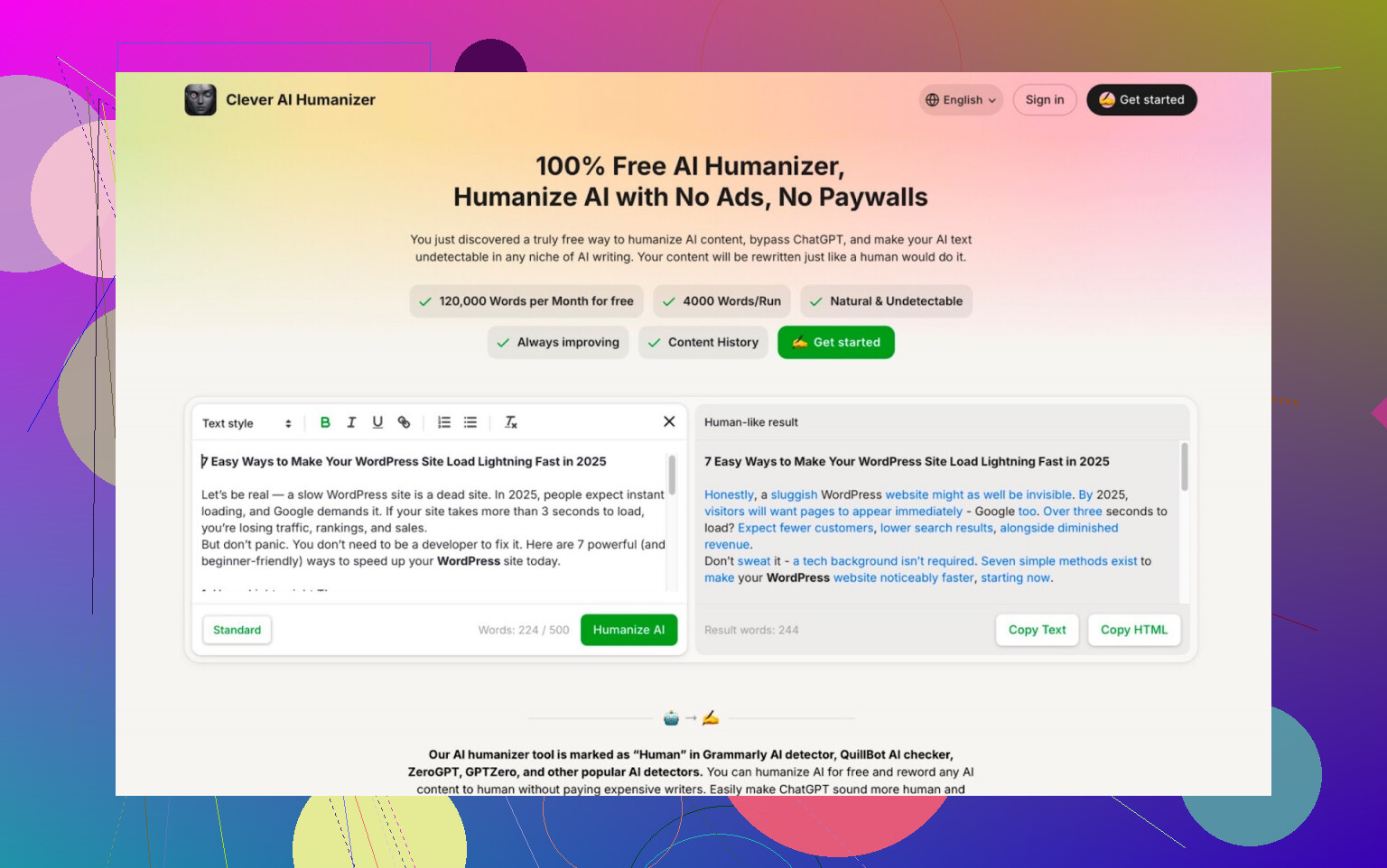 Cleverer KI-Humanizer? Ja, das war’s eigentlich, wenn du etwas Kostenloses und Schnelles willst. Es ist überraschenderweise kein kompletter Müll, besonders für einfache Aufgaben. Aber falle nicht auf das Verkaufsargument „unsichtbar für alle Detektoren“ herein – vor allem nicht bei den neueren Sachen wie GPTNulls März-Update oder AufsatzPrüfung 2025. Wenn du generischen KI-Text direkt durchjagst, geht es manchmal durch, aber meistens, wenn dein Original zu langweilig oder schematisch war, wittern die Detektoren es trotzdem. Glaub mir, ich habe den Fehler bei einer Hausarbeit gemacht und wurde markiert, selbst nachdem ich den Text durch drei „Humanizer“ hintereinander laufen ließ.