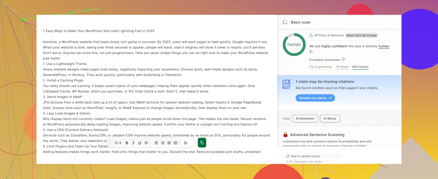 If you like a little chaos in your life, GPTZero has your back. Sometimes, it’ll call your text cool and human (0%), five minutes later it’s screeching “AI OVERLORDS” (100%). Ever since their big update last fall, you never really know what mood it’s in.